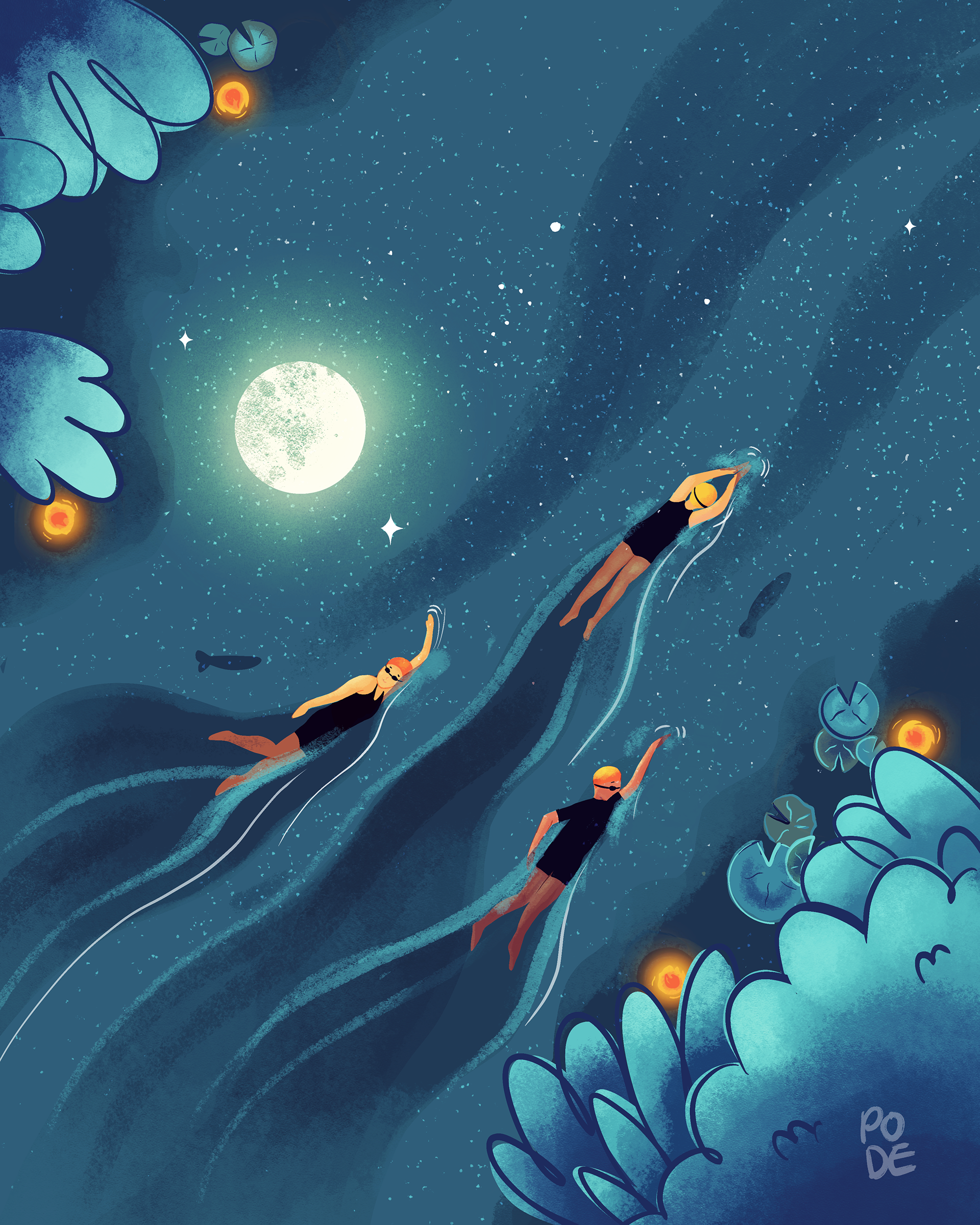 Entre l’eau et le ciel, les nageurs sont immergés dans deux univers, hors du temps.