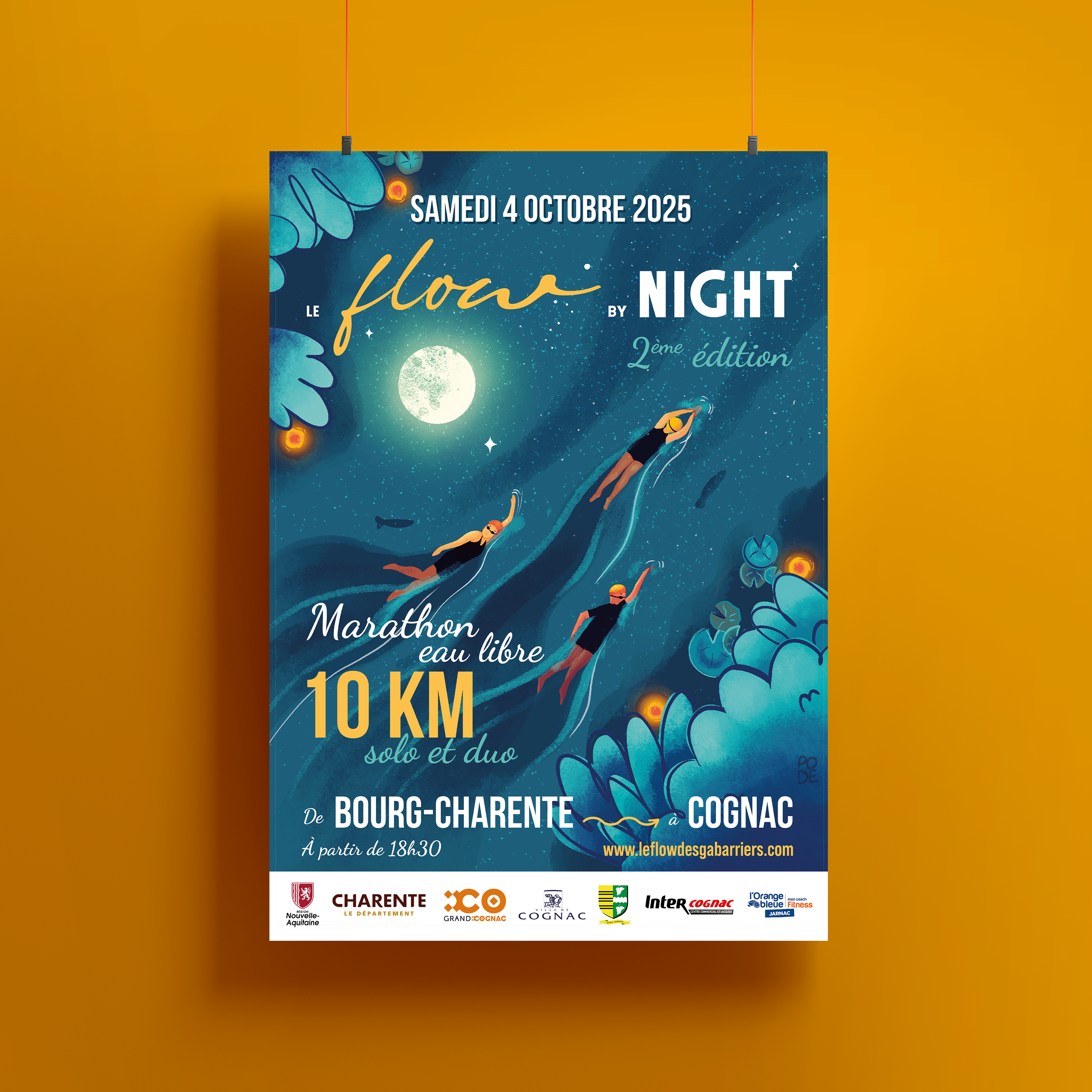 J’ai eu l’opportunité de réaliser l’affiche de la prochaine édition du Flow by Night organisé par l'association Le Flow des Gabarriers, un marathon nocturne en eau libre de 10km qui se tenait le 4 octobre 2025 entre Bourg-Charente et Cognac en Charente.