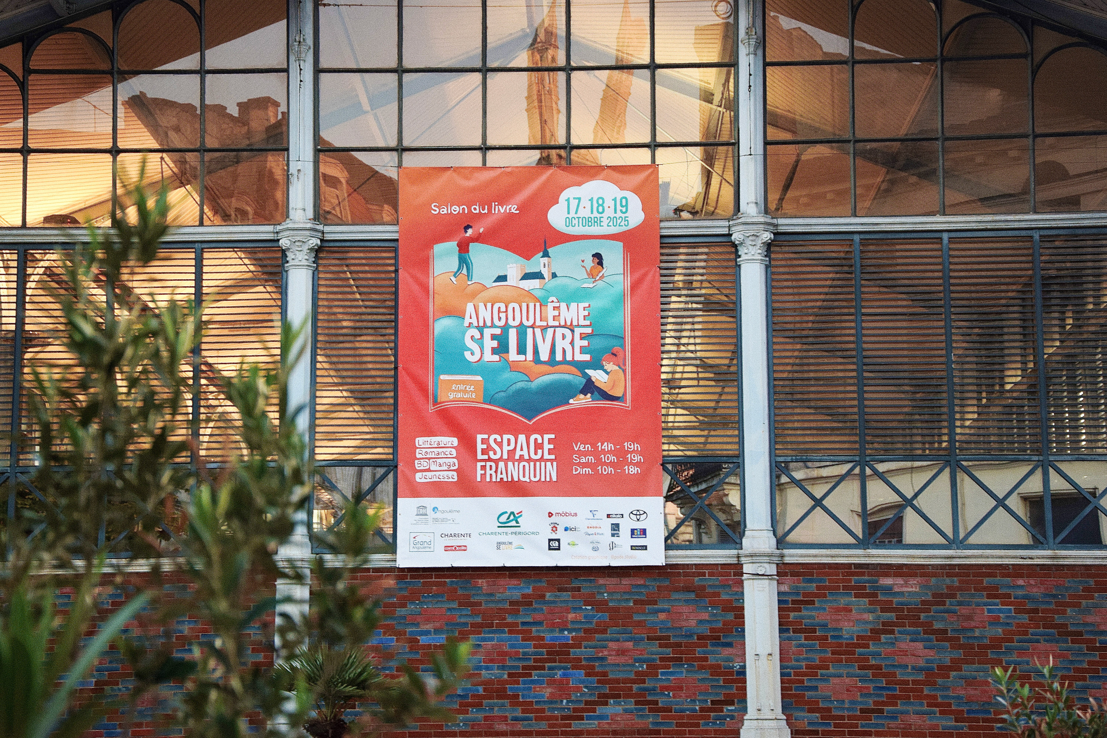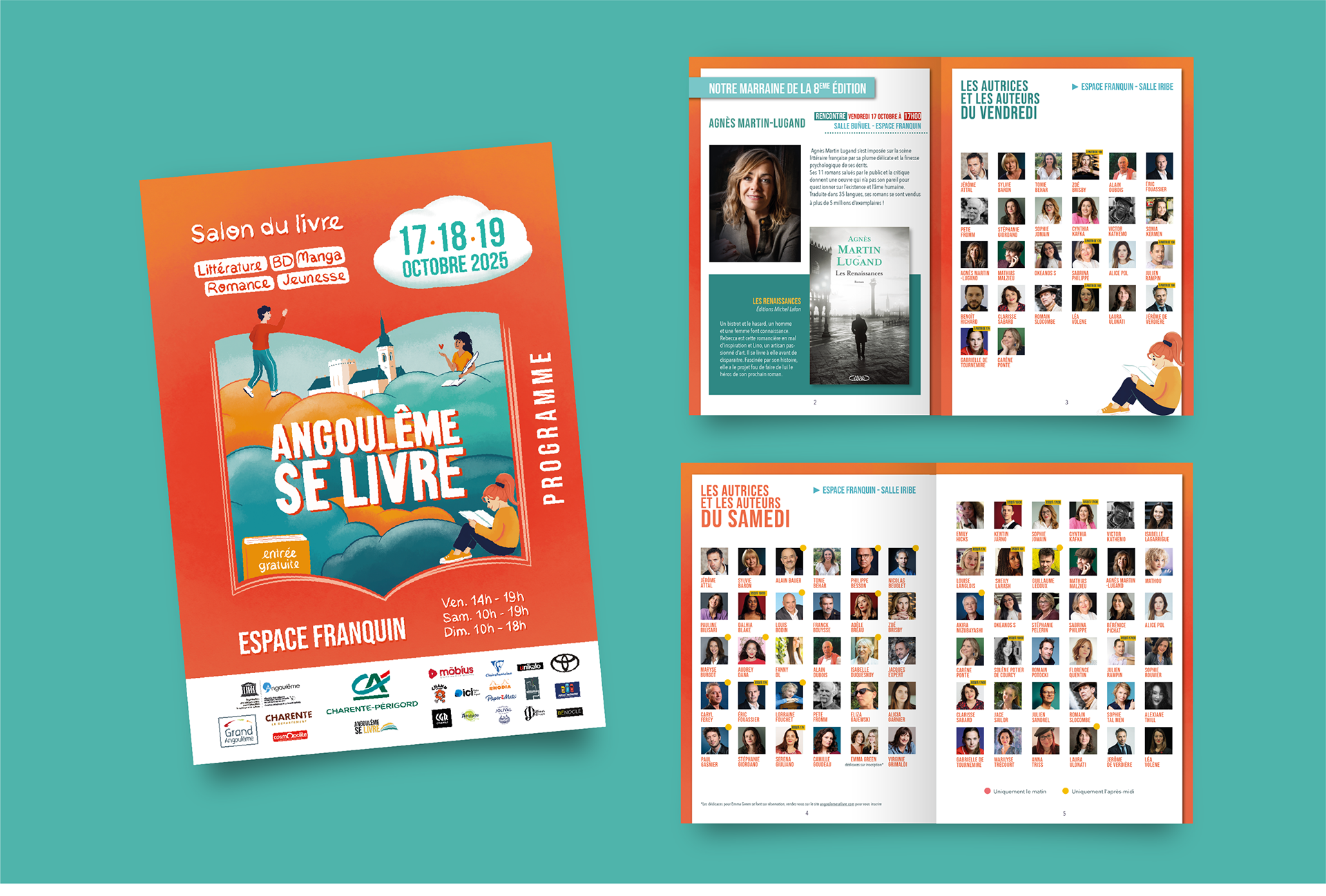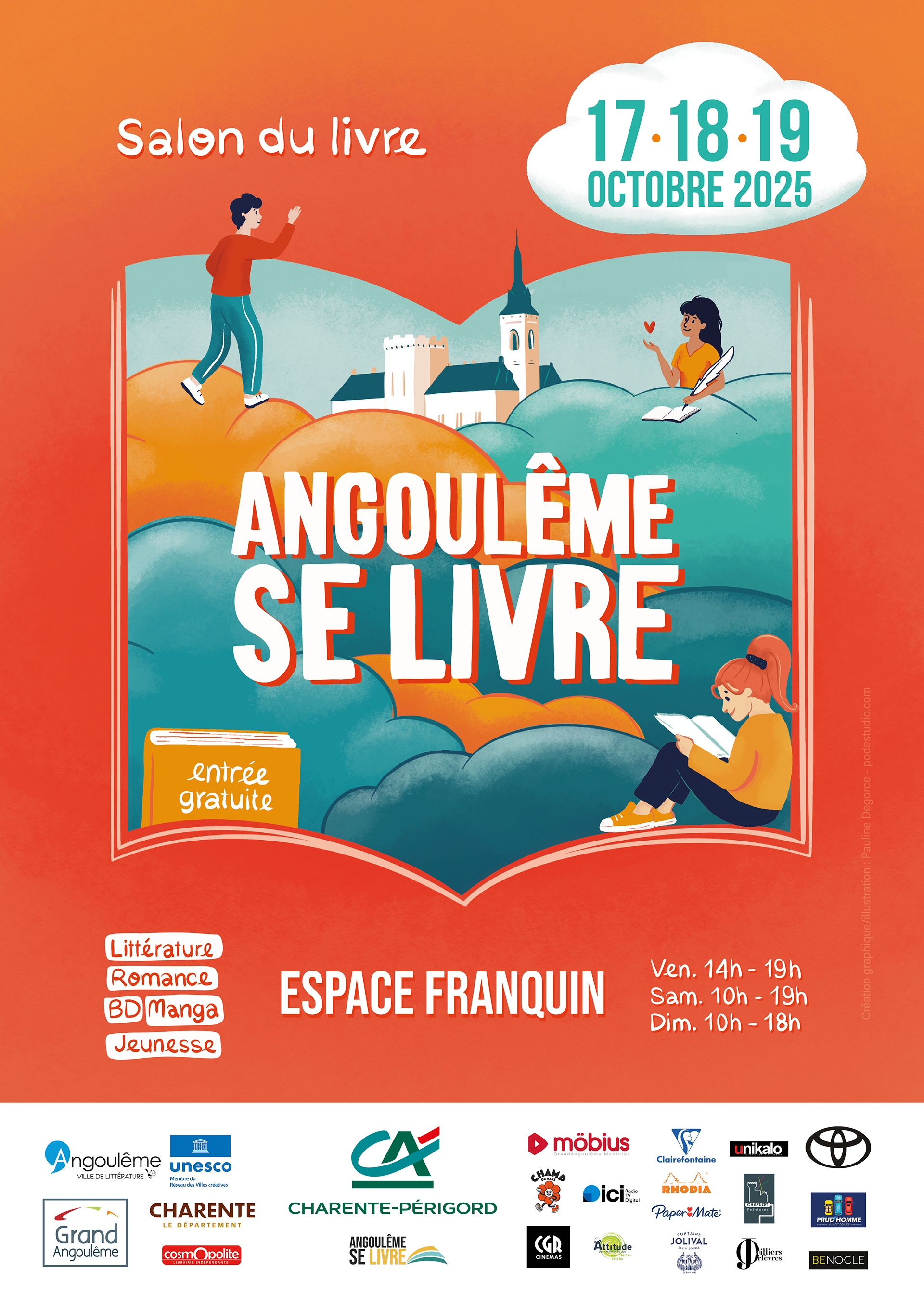 L'Association Culture Angoulême m'a contactée pour réaliser l'affiche de la 8eme édition du salon Angoulême se livre, avec une illustration personnalisée, joyeuse et unique. L'association m'a également demandé de décliner cette identité et le thème de l'affiche sur les différents supports de communication.