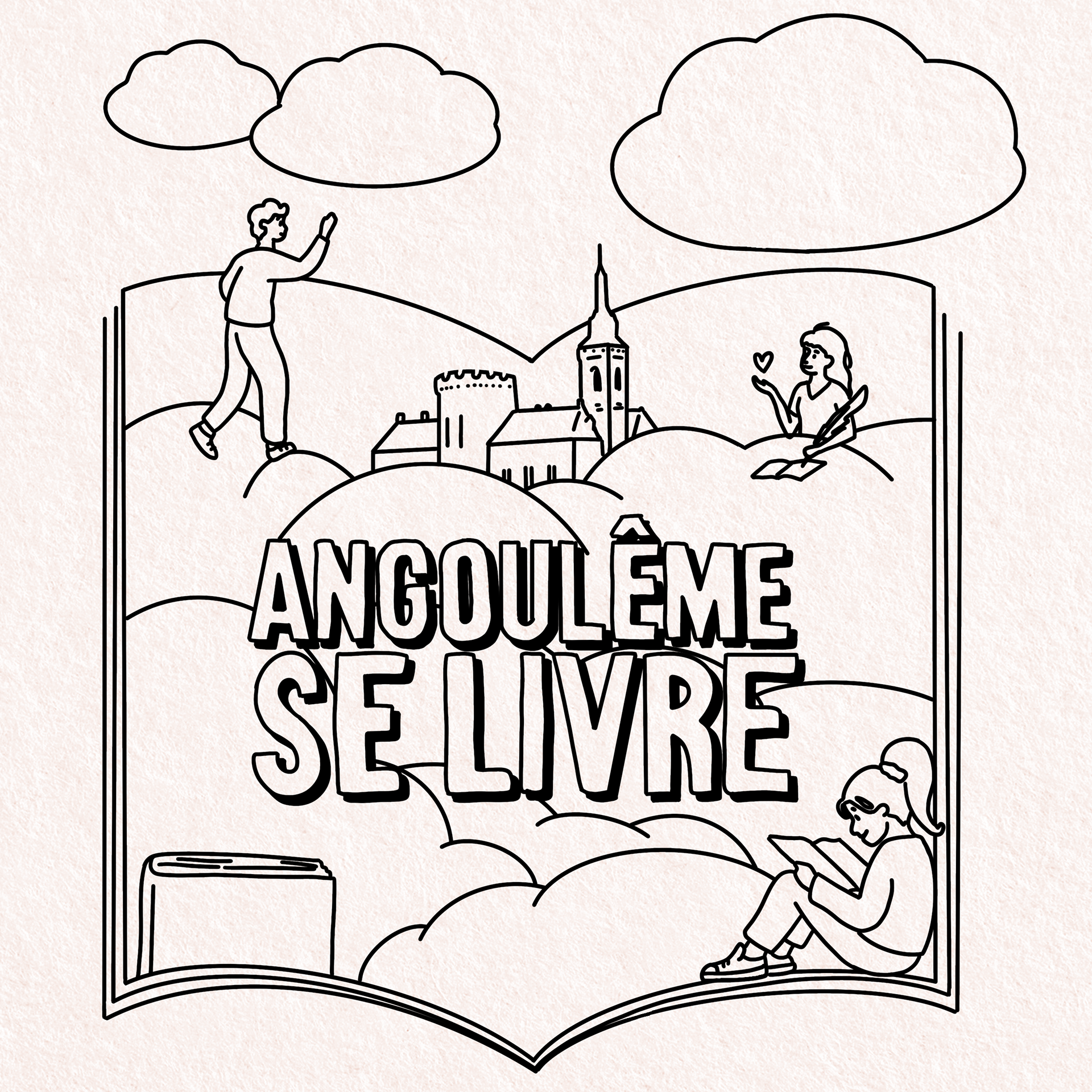 J'ai proposé un concept très coloré et joyeux qui mets en avant le lien humain entre les visiteurs et les auteurs présents lors du salon. La ville d'Angoulême est aussi à l'honneur dans cette proposition avec un illustration du bâtiment emblématique de la mairie de la ville. Afin d'illustrer la notion de lecture et de livre, j'ai choisie d'intégrer ce décors et ces personnages dans une forme de livre.